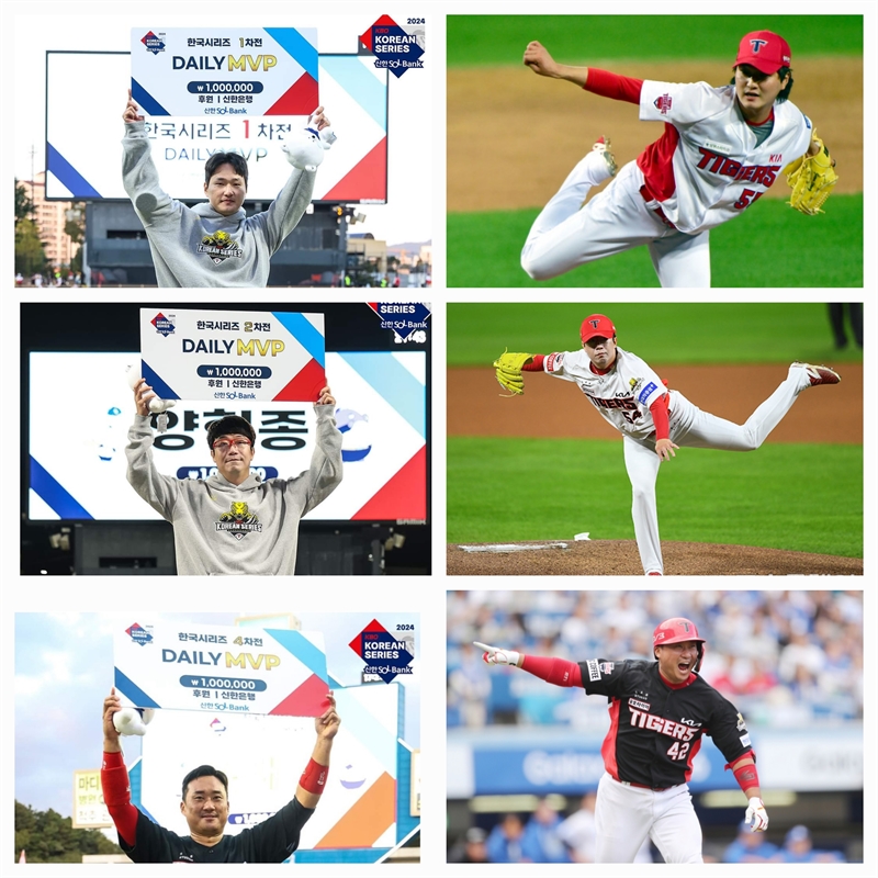 2024년 한국시리즈의 기아 타이거즈 1차 MVP 전상현, 2차MVP 양현종, 4차 MVP 김태군 선수들의 모습
