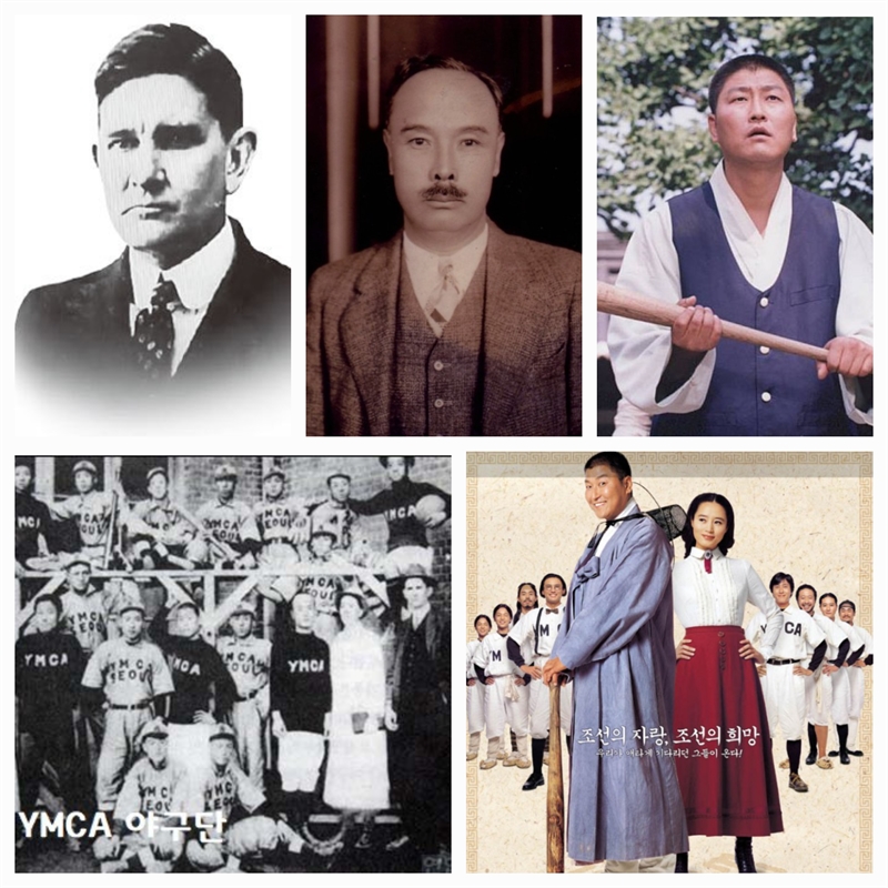 1904년 YMCA 야구단을 가르친 선교사 필립 질레트, 독립운동가이자 YMCA 야구단을 이끌던 여운형과 연기를 하던 송강호 배우, 우리나라 최초의 야구단 YMCA 야구단의 모습