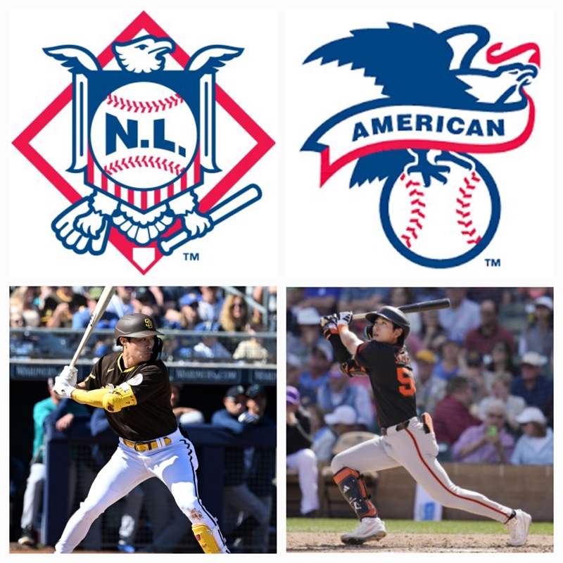 내셔널 리그와 아메리칸 리그 엠블럼, 한국인 메이저리거 샌디에이고 김하성 선수와 샌프란시스코 이정후 선수 모습