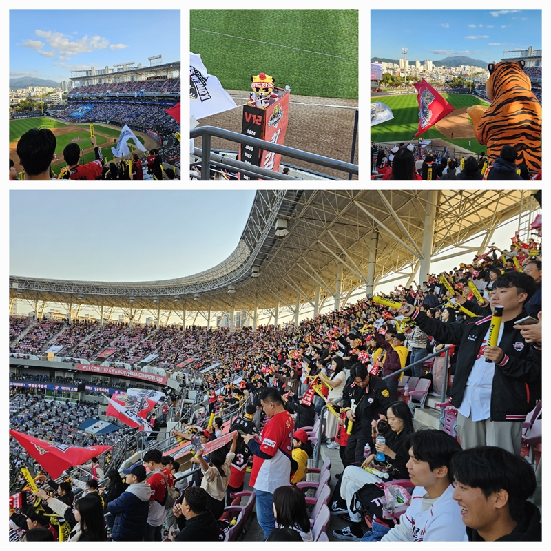 기아타이거즈를 응원하는 팬들의 모습과 챔피언스필드의 전경