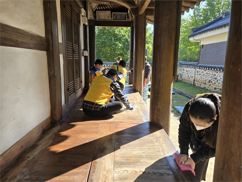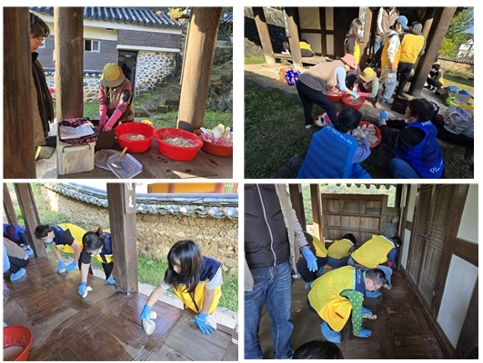 ◆ 국가유산지킴이 활동이 무엇인지 이야기 나누고 김오현 회원의 만주사 역사이야기를 듣고 난 초등학생은 만주사는 왜 국가유산으로 지정하지 않았는지 궁금해하였다◆ 콩댐을 하기 전에 마루 먼지 제거를 위해 짚솔로 청소를 한다. 양과동정에서 활동 시 만들었던 짚솔을 이용하여 마루를 청소하면서 눈으로 보았을 때와 달리 사이사이 많은 먼지들을 제거하고 깨끗이 쓸고 닦은 후 본격적으로 콩댐작업을 한다. 24시간 불린 콩과 들깨를 4대 1로 섞어서 간 다음 광목자루에 담아 마루를 결 따라 닦아낸다. 나무 사이사이 빈틈없이 닦아주는 시민들은 나무색이 달라지는 모습을 보며 신기해한다.