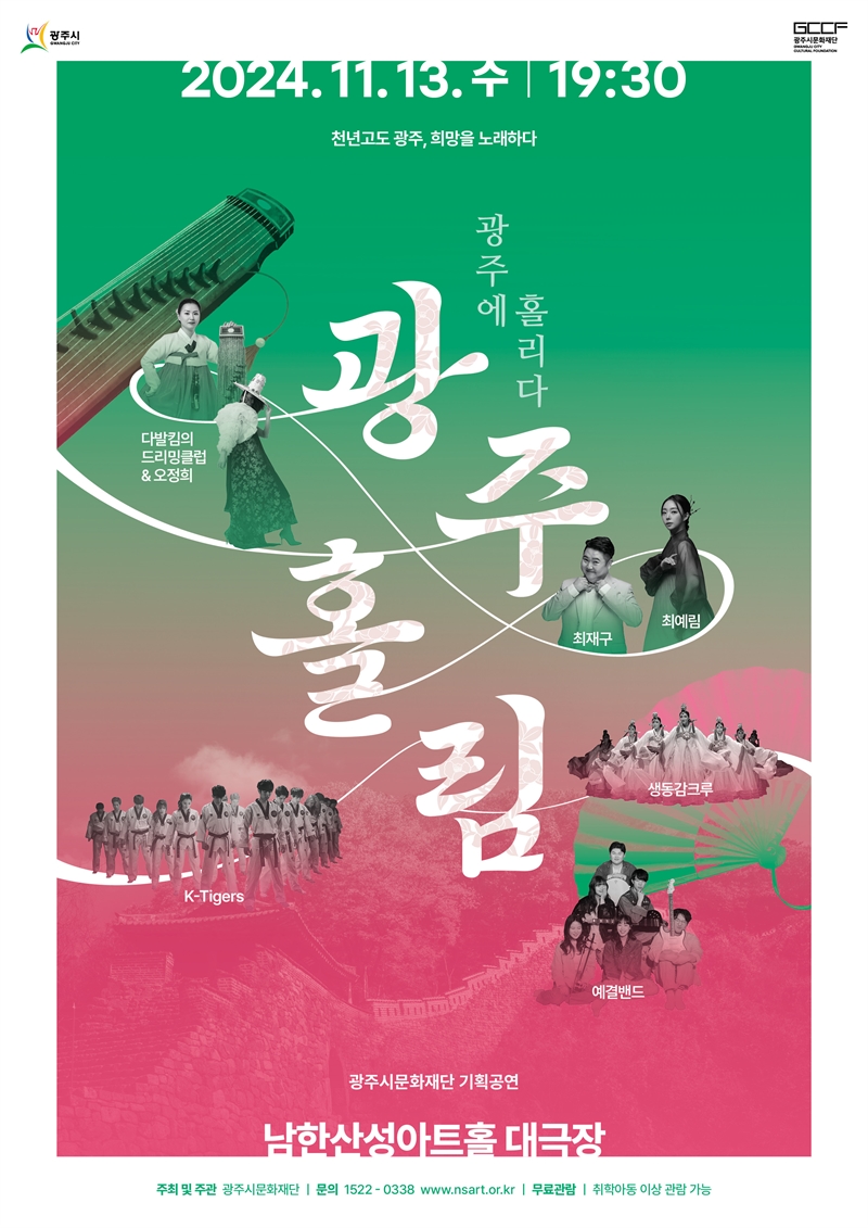 재단법인 광주시문화재단(대표이사 오세영)은 오는 11월 13일 수요일 19시 30분 남한산성아트홀 대극장에서 ‘천년고도 광주, 희망을 노래하다’를 슬로건으로 퓨전 국악 버라이어티쇼 “광주홀림”을 개최한다고 밝혔다.