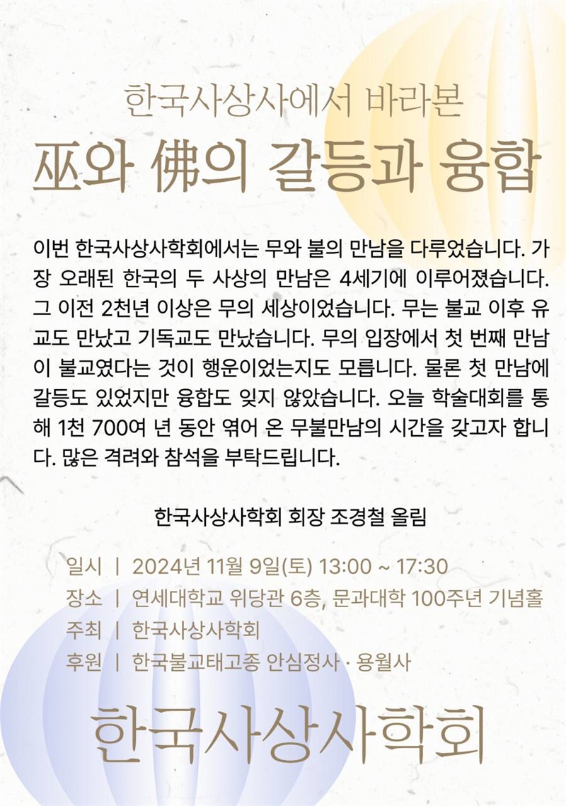 한국사상사학회(회장 조경철)은 오는 11월 9일(토) 연세대학교 위당관 6층(문과대학100주년 기념홀)에서 「한국사상사에서 바라본 무(巫)와 불(佛)의 갈등과 융합」이라는 주제로 학술대회를 개최한다. 조경철 연세대 교수(학회장)의 개회사로 시작되는 이 학술대회는 총 2부로 구성되었다.
