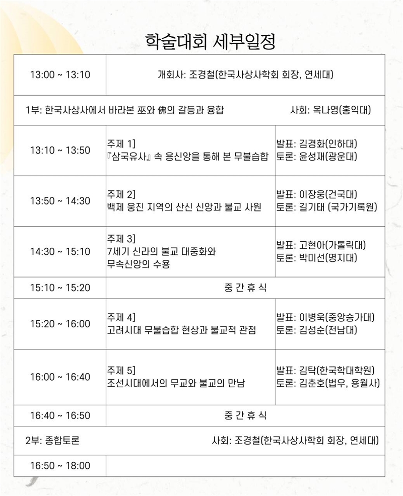 1부에서는 옥나영(홍익대)의 사회로 5편의 발표와 개별토론이 이어지며, 2부에서는 종합토론이 이어진다. 발표는 ▲「삼국유사 속 용신앙을 통해 본 무불습합」 김경화(인하대) ▲「백제 웅진 지역의 산신 신앙과 불교 사원」 이장웅(건국대) ▲「7세기 신라의 불교 대중화와 무속신앙의 수용」 고현아(카톨릭대) ▲「고려시대 무불습합 현상과 불교적 관점」 이병욱(중앙승가대) ▲「조선시대에서의 무교와 불교의 만남」 김탁(한국학대학원)으로 진행된다.