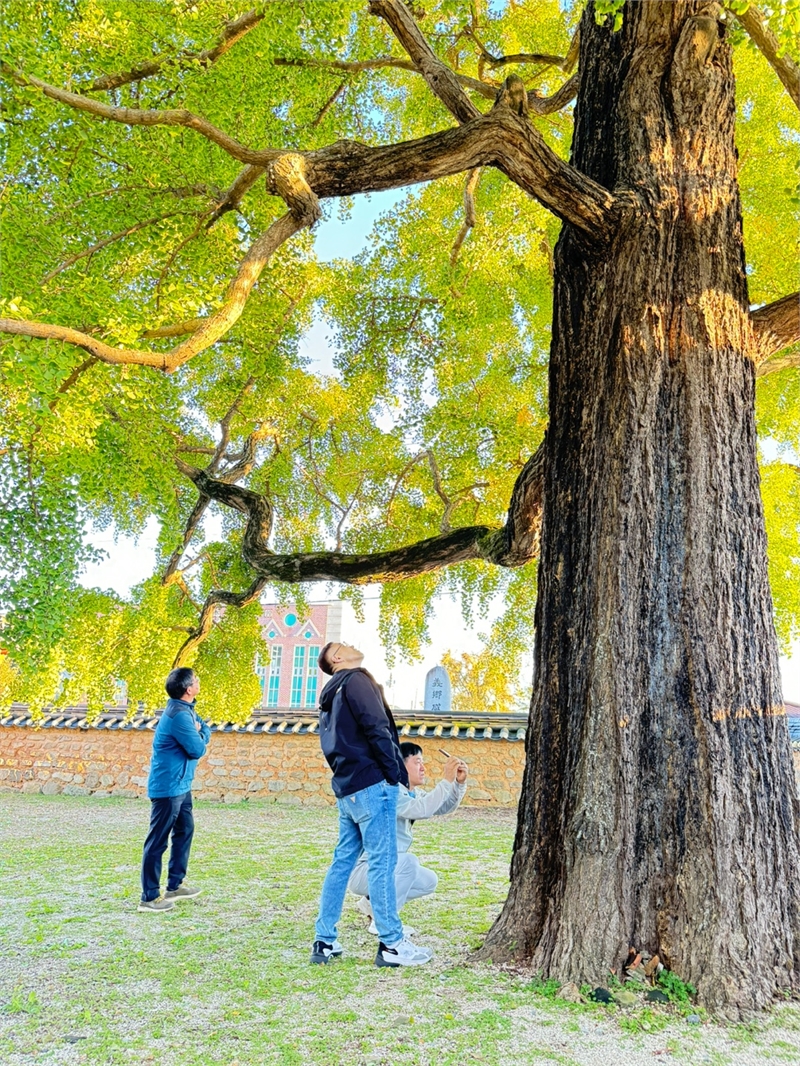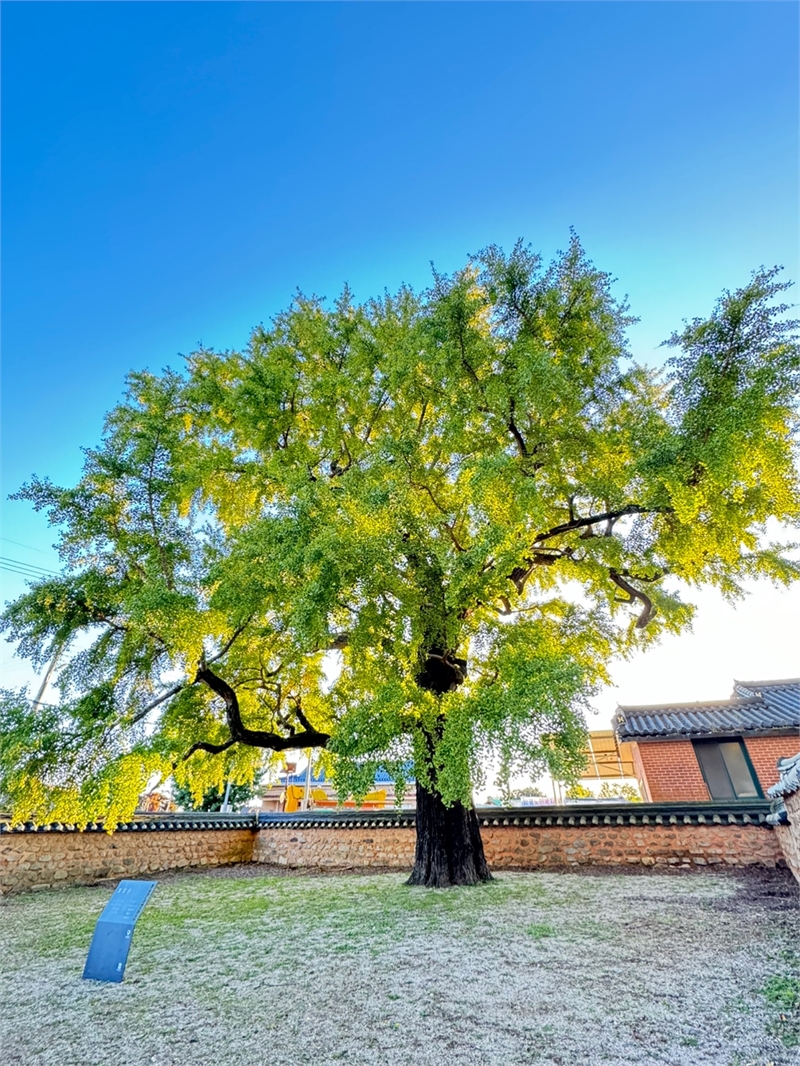 11월 어느 날 한창 가을이 익어가는 오후 햇볕의 따뜻함을 느낄 때 기아국가유산지킴이는 함평향교를 찾았다. 해가 뉘엿뉘엿 석양으로 넘어가는 시간 함평향교 대성전 앞뜰에 우뚝 서 있는 450년 된 은행나무는 가을 햇살 아래 황금빛으로 물들어 장관을 이루었다. 마치 향교의 역사를 품고 있는 듯한 은행나무는 방문객들에게 깊은 인상을 남겼다.