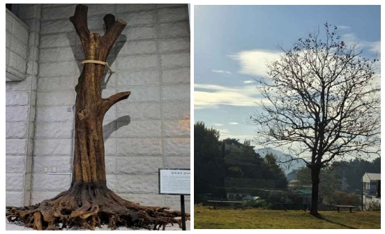 동학농민운동 최초 집결지인 말목장터 감나무(왼쪽은 태풍으로 쓰러진 감나무 오른쪽은 후계목)