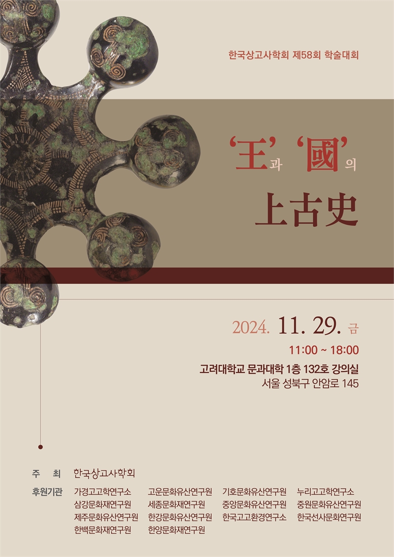 한국상고사학회(회장 조윤재)는 지난 11월 29일(금) 고려대학교 문과대 132호 강의실에서 제58회 학술대회를 개최했다. 매년 1차례 개최되는 한국상고사학회의 학술회의의 올해 주제는 「'王'과 '國'의 상고사」로 일상적으로 사용하고 있는 '왕'과 '국'의 개념에 대해서 문헌사와 고고학에서의 깊이 있는 탐구가 시도되었다.