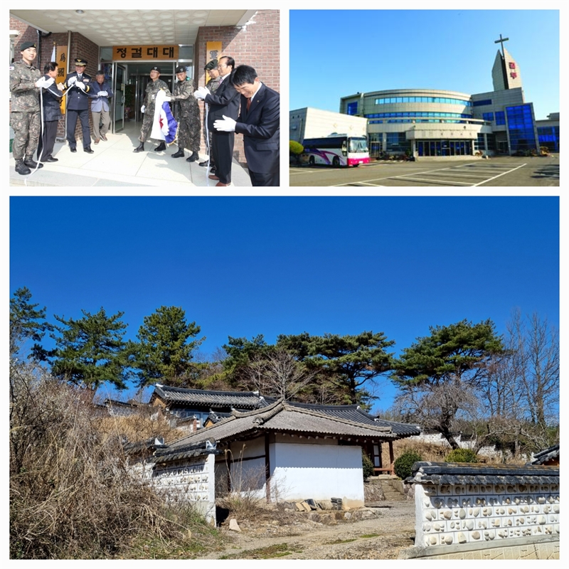 위의 왼쪽부터 고흥 지역의 '정걸대대'/정걸장군 생가터(현재 길두교회)/안동사의 전경