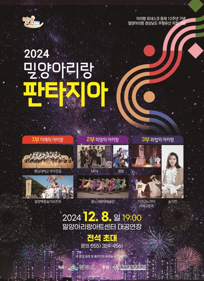 밀양문화관광재단(대표이사 이치우, 이하 재단)은 오는 8일 오후 7시 밀양아리랑아트센터 대공연장에서‘2024 밀양아리랑 판타지아’공연을 개최한다.