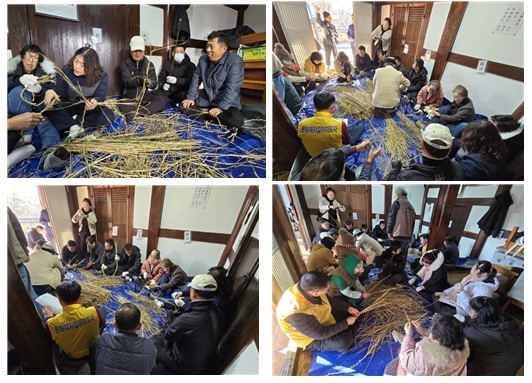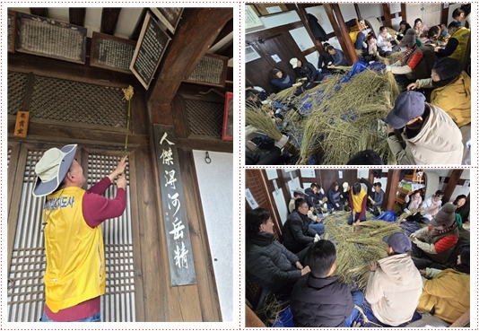 ◆ 2025년 국가유산 지킴이 활동 시 사용할 짚솔을 미리 만들어 놓는 작업을 진행하였다. 짚솔은 벼를 수확하고 남은 짚을 이용하므로 짚을 구하기 쉬운 가을철에 짚을 구해 바람이 잘 통하는 곳에 말려두었다 사용하여야 한다. 요즘은 벼를 수확하면서 기계를 사용하기에 짚을 바로 절단하여 퇴비나 가축의 사료로 사용하기 때문에 짚을 구하기도 쉽지 않다 짚을 구하기 위해선 농가에 미리 부탁하여 짚을 구해야 한다. 기계 작업이 아닌 수작업으로 수확해야 볏짚을 사용할 수 있다. 일 년 사용할 짚솔은 지금 만드는 이유이다