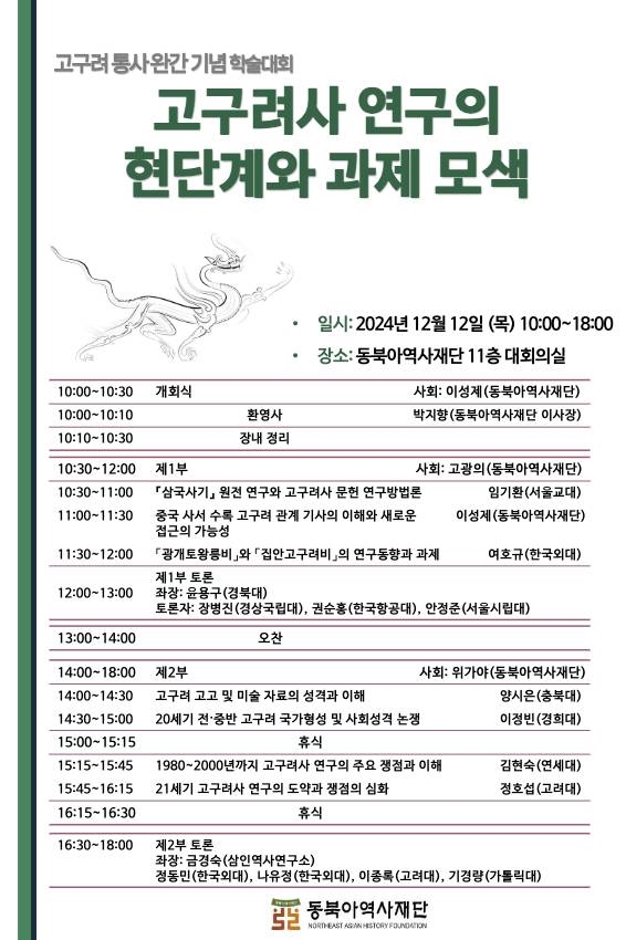 동북아역사재단(이사장 박지향)은 12월 12일(목) 오전 10시 재단 11층 대회의실에서 『고구려 통사』 시리즈 10권의 완간을 기념하여 「고구려사 연구의 현 단계와 과제 모색」이라는 주제로 학술회의를 개최한다.