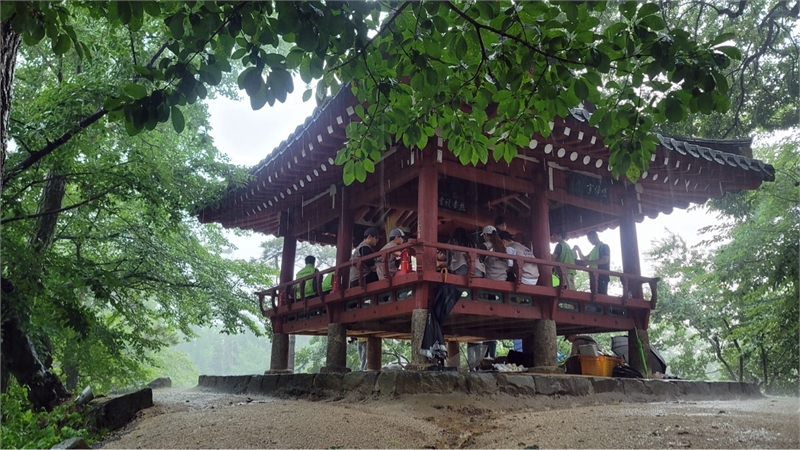 6월 정기활동시 만귀정에서 짚솔만들기 체험에 비가 많이 내려 만귀정에 30여명이 올라 앉아 옹기종기 모였다.