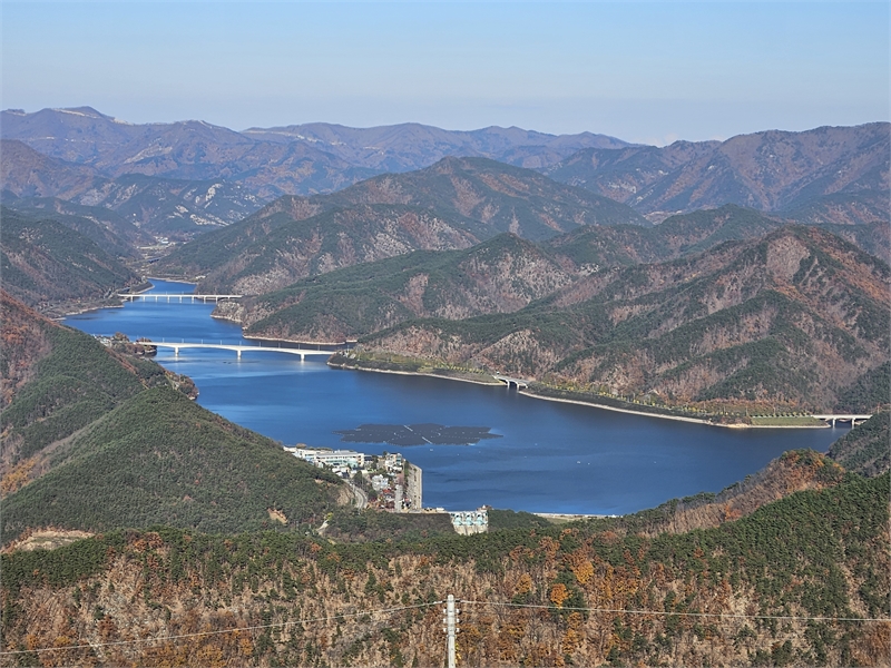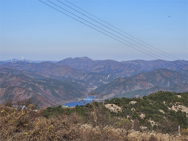 화산마을은 오지마을이지만 주로 고냉지 배추 농사를 지으며 한때 초등학교도 있을 정도로 어느 정도 규모가 있었다. 이젠 20여 가구만 남았다고 한다. 풍차전망대에 가니 저 멀리 군위호와 군위댐이 보인다. 날이 맑아서 호수 물빛이 영롱한 파랑으로 아름다웠다.