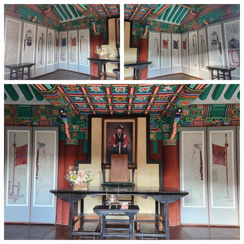 충렬사 정침 이충무공의 위패와 좌우에 펼쳐져 있는 팔사품 병풍 2벌 모습