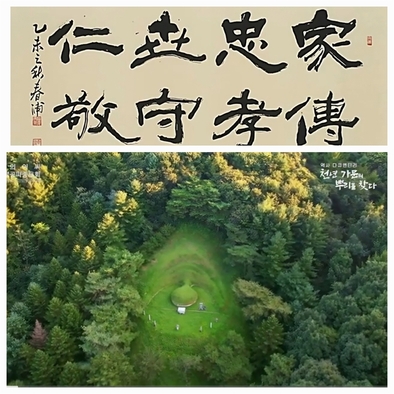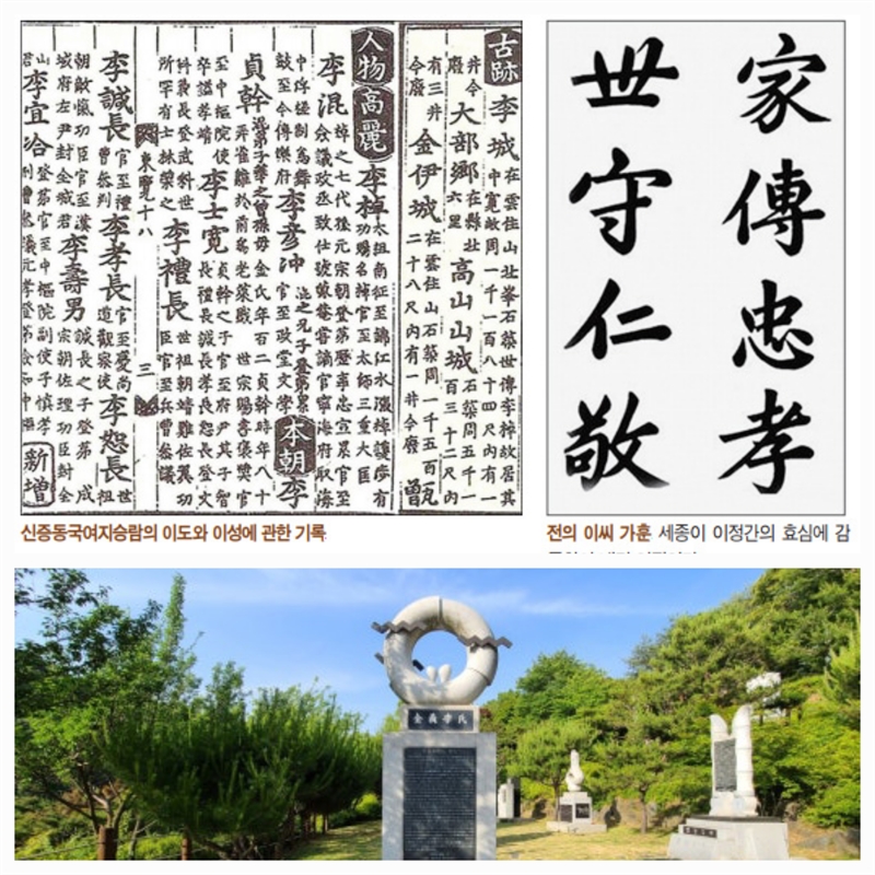 전의예안이씨 가훈으로 세종이 이정간의 효심에 감동하여 내린 어필과 세종특별자치시 전의면 유천리에 있는 시조 이도의 묘소를 드론으로 본 전경(사진제공 네이버 검색, 전의예안이씨 화수회)