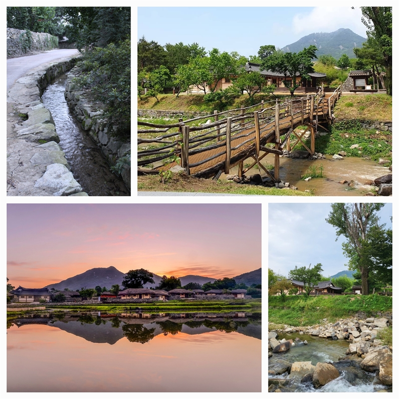 설화산에서 내려오는 맑은 개울, 나무다리, 석양에 물든 외암인속마을의 전경