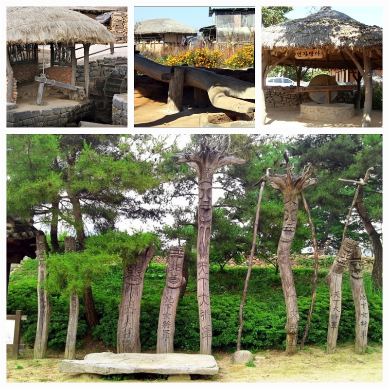 외암민속마을 위의 왼쪽부터 물레방아, 디딜방아,연자방아, 다양한 장승들...
