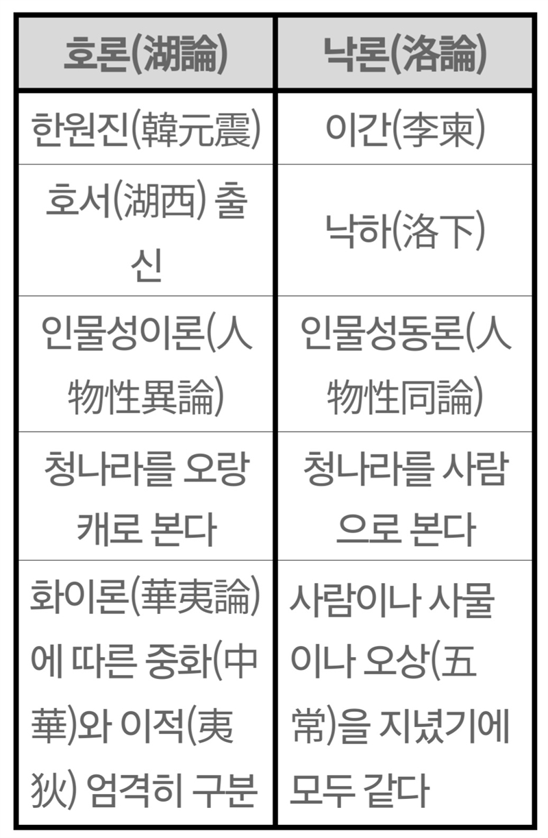 이간(李柬)의 주장은 주로 낙양(洛陽), 즉 서울·경기 지역의 학자들이 많이 동조해서 낙론(洛論)이라고 하고 호서(湖西), 즉 충청도의 학자들은 대개 한원진(韓元震)의 주장에 동조했기 때문에 호론(湖論)이라고 하였다. 낙론(洛論)과 호론(湖論)의 쟁점은 크게 두 가지였다. 우선 인물성동이론(人物性同異論), 즉 금수(禽獸, ‘날짐승과 길짐승’이라는 모든 짐승)도 사람처럼 오상(五常, 인·의·예·지·신)을 가지고 있나 없나 하는 문제이다. 또 하나는 사람이 정(情, 희노애락)이 발동하지 않은 미발(未發, 일이 아직 일어나지 않음)의 상태일 때 선악이 나타날 수 있는 기질이 있나 없나 하는 문제였다. 이간(李柬)은 18세기 이후 기호학파 내에서 100여 년 이상 지속된 인성(人性)과 물성(物性)의 동이(同異)에 관한 논쟁에서 인물성동론(人物性同論)의 단초를 개척한 학자였다.