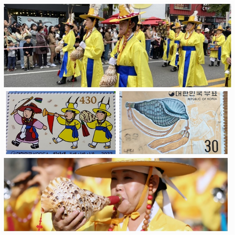 피리정악 및 대취타(대한민국의 국가무형문화재)의 행사 모습과 우표 나각 모습(사진제공 네이버검색)