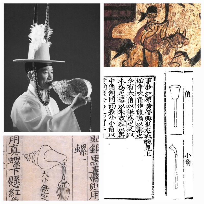 음 관악기인 나각(螺角), 덕흥리 고분벽화 기마 인물의 고각( 鼓角), 악학궤범의 나각(螺角)그림, 국조오례서례 권4 군례 형명의 도설 각뿔나팔 그림