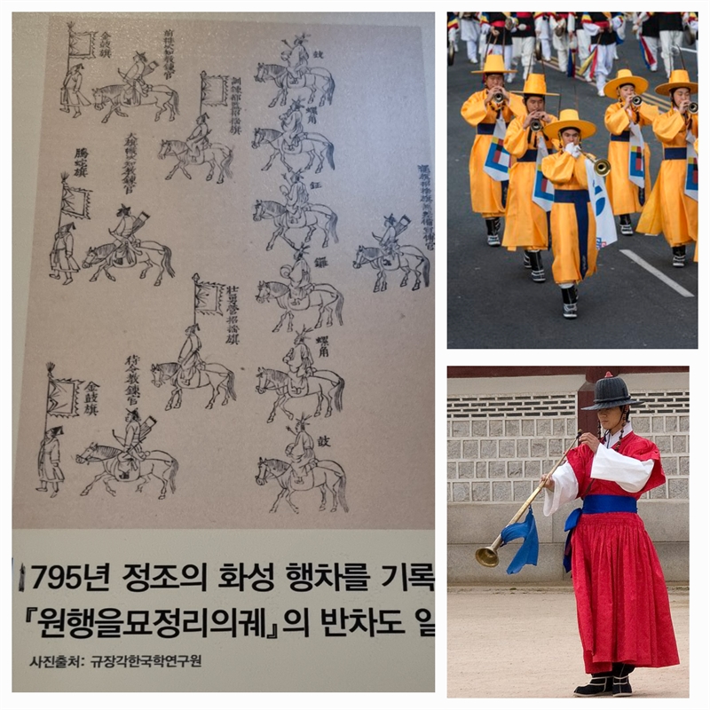 1795년 정조의 화성 행차를 기록한(원행을묘정리의궤)의 반차도 일부, 피리정악 및 대취타(대한민국의 국가무형문화재), 나발을 연주하는 모습