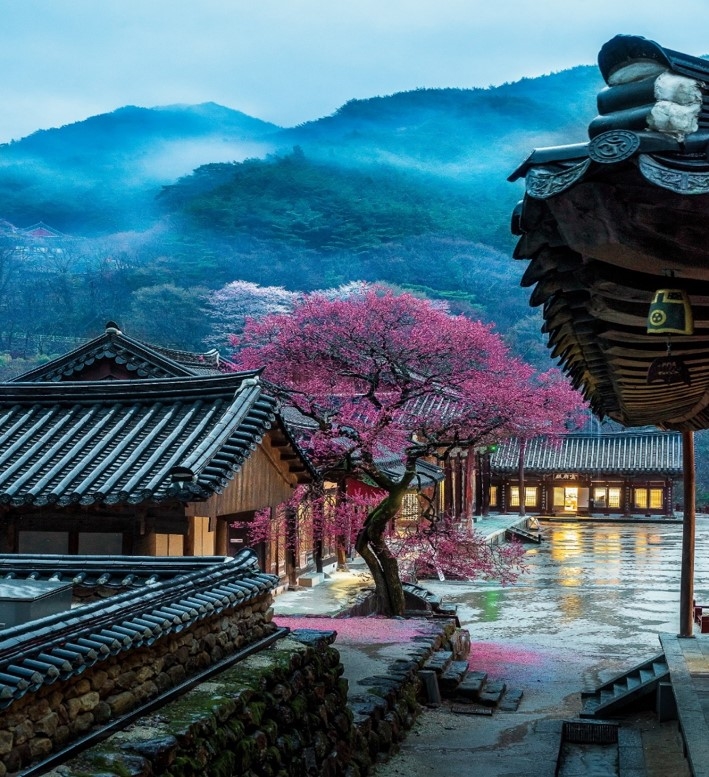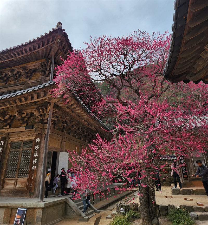 차가운 바람이 채 가시지 않은 3월 말, 천년 고찰 구례 화엄사(求禮 華嚴寺)에 붉은 꽃망울이 활짝 피어나 봄 소식을 전하고 있다. 화엄사의 명물인 홍매화(紅梅花)가 절정을 이루며 고즈넉한 사찰 경내를 붉게 물들이고 있어 상춘객들의 발길을 사로잡고 있다. 화엄사 홍매화(華嚴寺 紅梅花)는 천연기념물(天然紀念物)로 지정될 만큼 빼어난 아름다움을 자랑한다. 붉은 융단을 깔아놓은 듯 화려한 꽃잎과 은은하게 퍼지는 매화 향기는 봄의 정취를 더한다. 특히 각황전(覺皇殿) 옆에 자리한 수령 300년이 넘는 고목 홍매화(紅梅花)는 오랜 세월의 흔적을 고스란히 담고 있어 더욱 웅장하고 아름다운 자태를 뽐낸다. 이 홍매화(紅梅花)는 조선 숙종(朝鮮 肅宗) 때 심어진 것으로 알려져 있으며, 일반적인 홍매화(紅梅花)보다 붉은빛이 더욱 강하고 검붉은 색을 띠어 '각황매(覺皇梅)' 또는 '흑매화(黑梅花)'라고도 불린다.