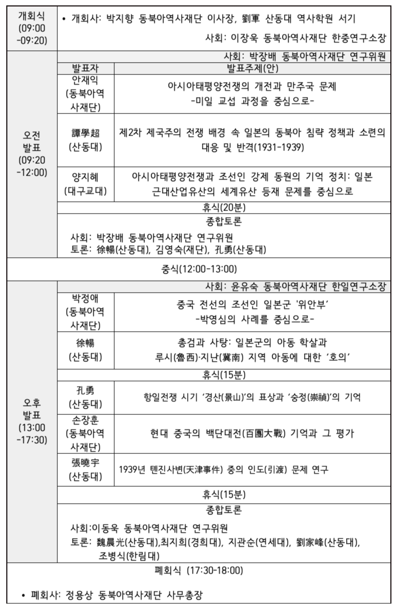 한국과 중국 두 나라는 과거 일본의 침략과 식민 지배를 당한 역사의 상흔을 공유하고 있다. 동시에 중국에 있던 한국의 독립운동가들이 중국인들과 연대하여 일본 제국주의의 침략에 저항한 역사를 공유하고 있기도 하다. 이번 학술회의에서는 한국과 중국 측에서 각각 4명의 발표자가 중일전쟁과 제2차 세계대전 시기의 국제관계, 일본군의 전쟁 범죄, 전쟁에 관한 역사 기억 등 다양한 주제의 글을 발표해, 그간 축적해 온 연구 성과와 문제의식을 공유한다.