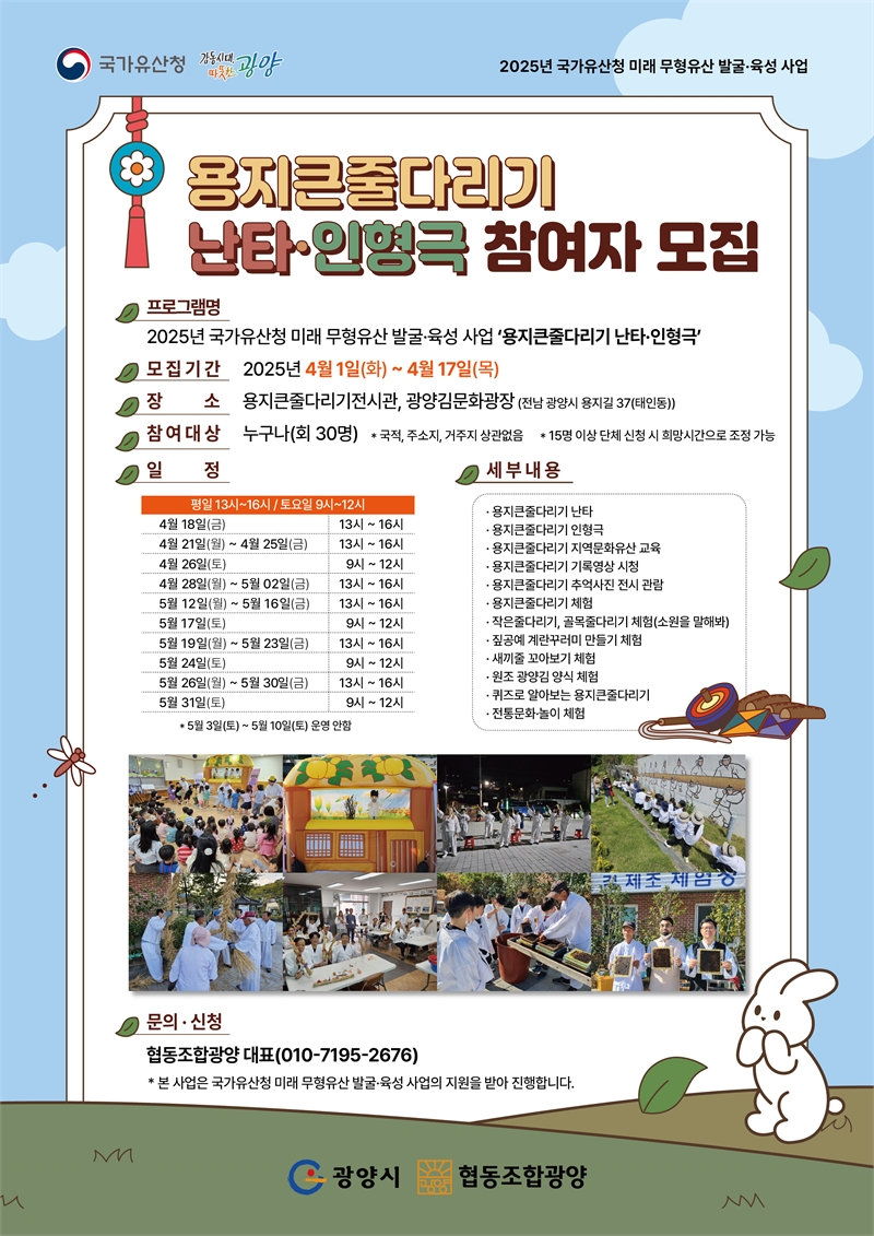 박물전시 > 사진영상 광양용지큰줄다리기 난타·인형극 참여자 모집 - 모집기간 2025년 4월 1일(화) ~ 4월 17일(목) 김대성 전문기자 승인 2025.04.03 14:51 0 3 0 K헤리티지뉴스 김대성 전문기자 kimds321@hanmail.net 김대성 전문기자의 기사 더보기 KHFⓒ All Rights Reserved