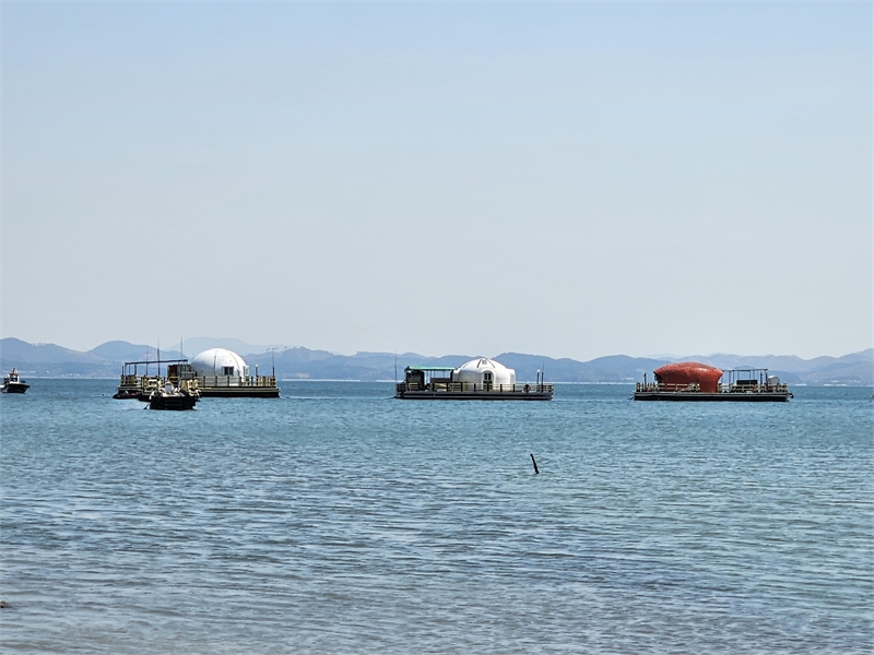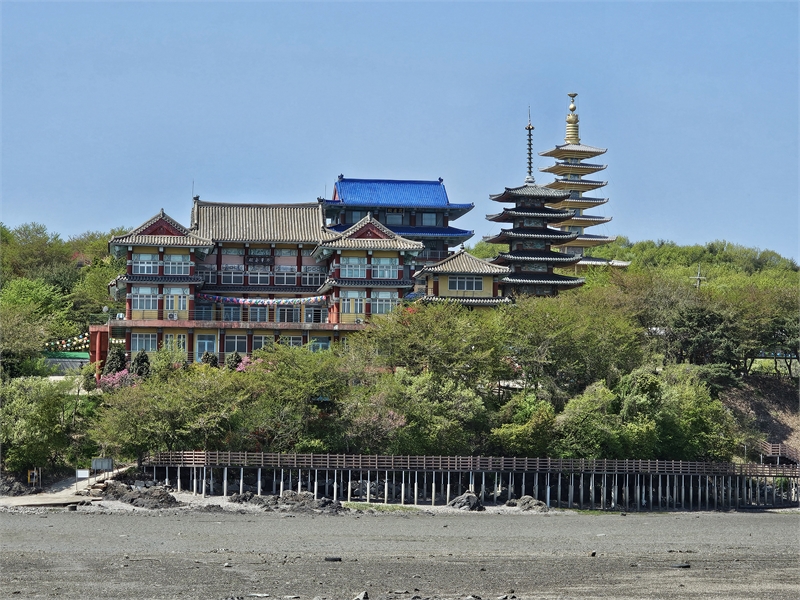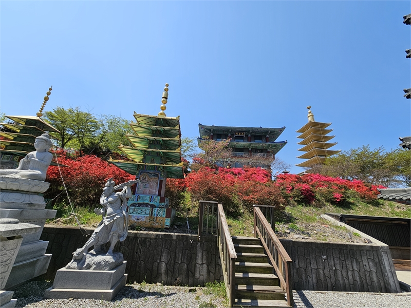 바다에서 바라보는 안면암의 풍광은 또 다르다. 여우섬을 천천히 돌아본 뒤 뭍으로 돌아 오며 만나는 안면암은 이국적인 모습을 보여 준다. 3층으로 지어진 안면암의 건축도 독특 하다. 마치 단양 구인사를 보는 듯 계단으로 이어진 법당이 극락보전, 비로전, 나한전으로 연결된다. 법당 앞에 서서 바다 풍광 을 바라보는 것도 특별 하다. 삼성각과 용왕각도 함께 자리하고 있다. 무량수전과 신중단의 돌탱화를 비롯해 다양한 탱화도 볼 수 있다. 법당을 둘러싸고 있는 야외공간 에는 다양한 크기의 불상과 불탑들이 있어 눈길을 끈다.