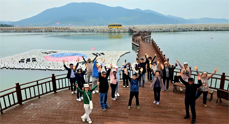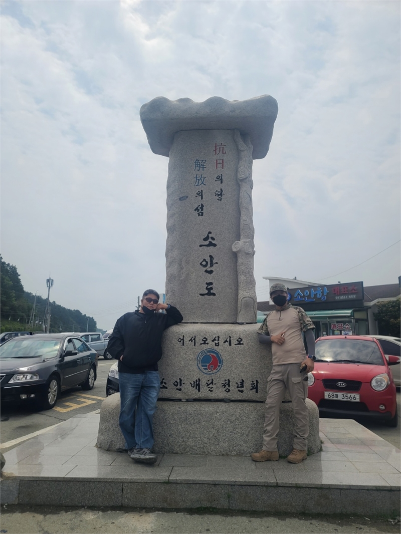 소안도 태극기 부표를 배경으로 만세를 외치는 회원들<사진 박미경?