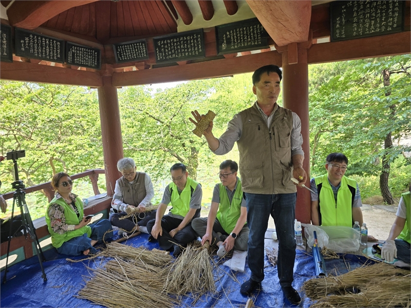 비온 후 후덥지근한 날씨에도 만귀정에 모여 짚솔체험과 만귀정에 대한 이야기꽃을 피운 기아국가유산지킴이들(사진 고경임)