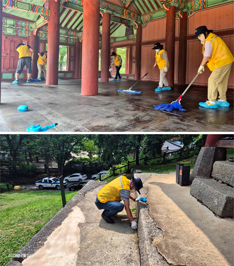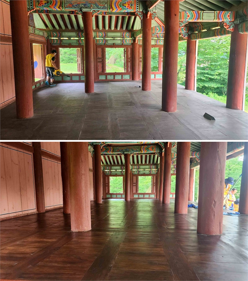 연무관 정화 활동에서는 내외부 먼지 제거는 물론, 마룻바닥에 마른 걸레질과 함께 들기름을 발라 윤을 내주는 작업이 진행됐다. 이러한 세심한 관리는 목재 바닥의 내구성을 강화시켜 주고 청결한 상태를 오래 유지할 수 있게 하는 효과를 기대할 수 있다. 또한 건물 기단부에 자란 잔디를 제거하여 문화재의 미관을 개선하고 구조적 안정성을 확보하는 데 기여했다.