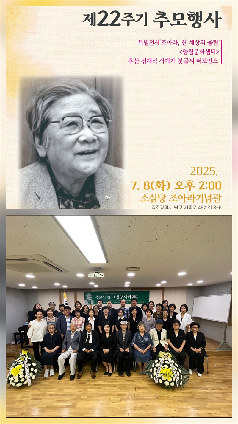 이번 22주기 추모 행사는 추모식, 특별 전시, 북글씨 퍼포먼스로 구성되었으며, 광주시민들의 적극적인 참여 속에 진행되었다. 이날 강연자로 나선 정인서 광주광역시 서구 문화원장은 "조아라 정신은 여성노동 아카이브, 구술사, 학교 연계 교육 등을 통해 디지털로 확장돼야 한다"고 강조했다. 또한 앞으로 소심당 조아라기념관이 선생의 숭고한 정신을 디지털 시대에 맞춰 더욱 널리 알리고, 미래 세대에게 끊임없이 영감을 주는 살아있는 교육의 장이 되기를 기대해본다.