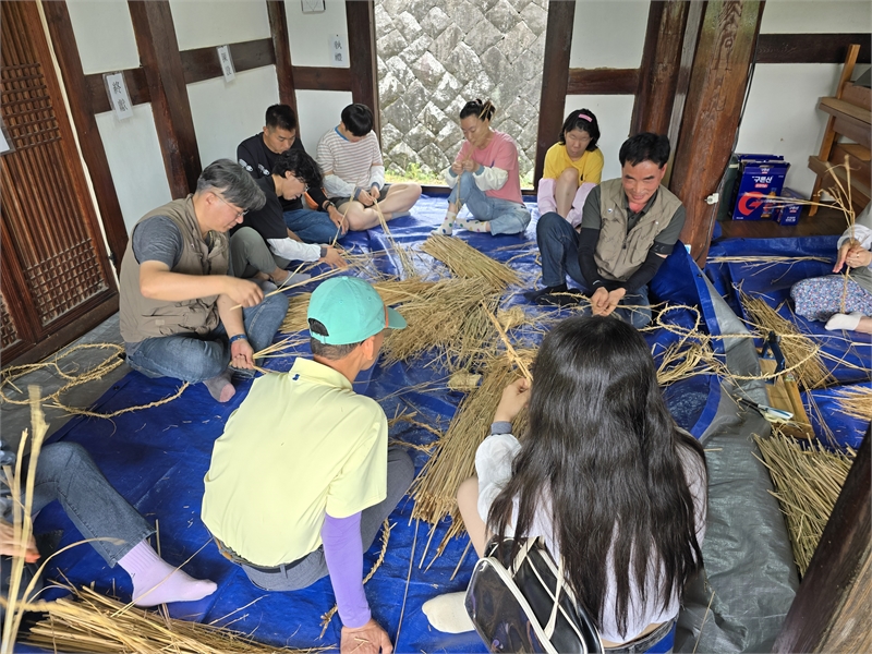 이형만 지도사와 함께 새끼를 꼬고 있는 자원봉사자들