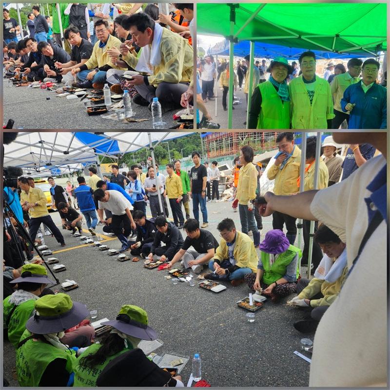 박찬대 더불어민주당 대표 후보가 마륵동 다스리 가구백화점 수해 복구 현장을 방문해 자원봉사자 들과 도시락 점심을 함께하며 현장의 애로사항을 청취하고 봉사들과 기념 촬영한 모습