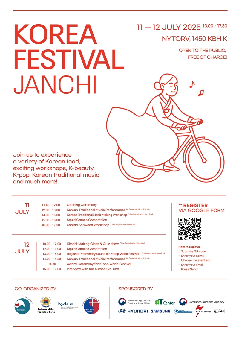 지난 7월 11일부터 12일까지, 덴마크 코펜하겐 시내 중심부의 Nytorv 광장에서 ‘2025 한국주간행사 Korea Festival “Janchi(잔치)”’가 성대하게 열렸다. 이번 행사는 주덴마크 대한민국 대사관, 덴마크 한인입양인협회(Korea Klubben), 한인회, 코펜하겐무역관이 공동 주최하며, 덴마크 현지 시민들과 한국문화에 관심 있는 방문객 약 15,000여 명이 참여해 한국문화를 향유하는 축제의 장이 되었다.