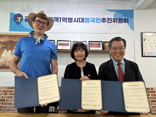 K헤리티지재단(이사장 박동석)은 지난 28일, 글로벌관광객 1억명 시대를 펼치기 위해 국제교류문화진흥원(원장 유정희)와 글로벌관광객 1억명시대 범국민추진위원회(대표 이참)와 업무협약(MOU)을 체결하였다.