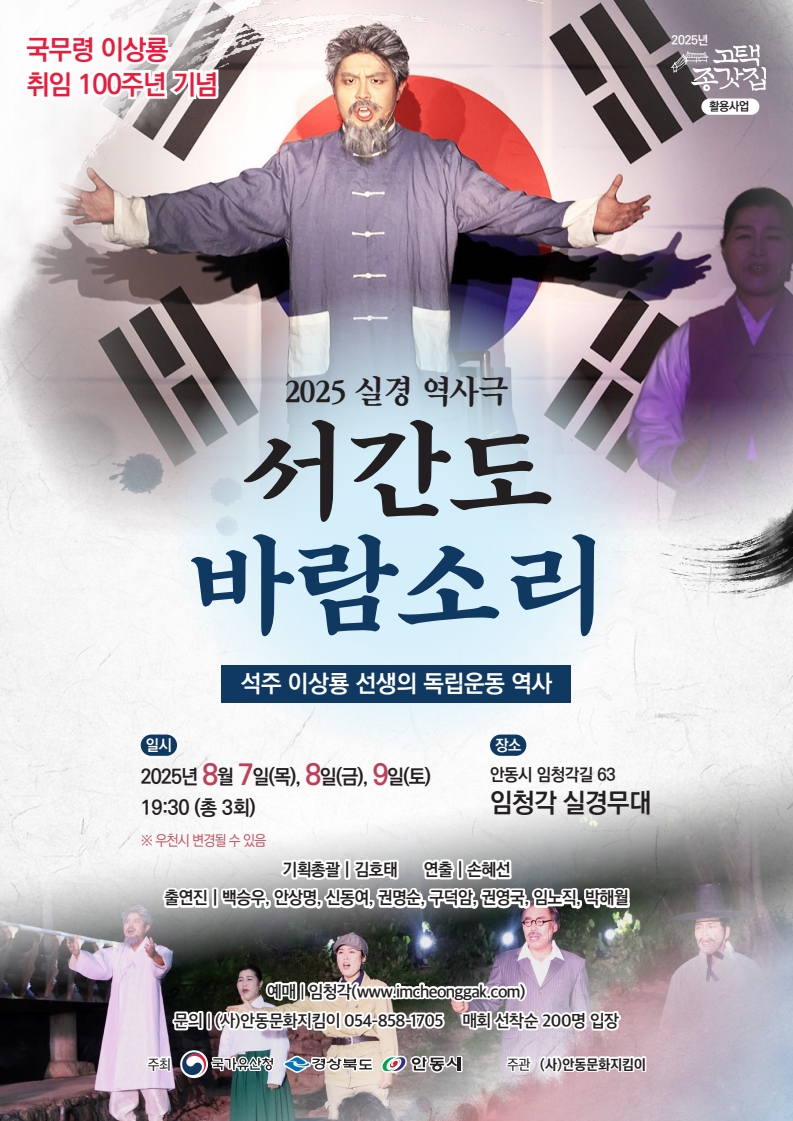 교육활용 국무령 이상룡 취임 100주년 기념 '2025 실경 역사극 "서간도 바람소리"' 개최 2025 고택 종갓집 활용사업으로 8월 7일부터 9일까지 임청각 실경무대에서 개최 석주 이상룡 선생의 독립운동 역사에 대한 이야기, 온라인 예매 선착순 200명 문귀호 선임기자 승인 2025.08.04 08:07 0 1 0 K헤리티지뉴스 문귀호 선임기자 moon3874@naver.com 문귀호 선임기자의 기사 더보기 KHFⓒ All Rights Reserved