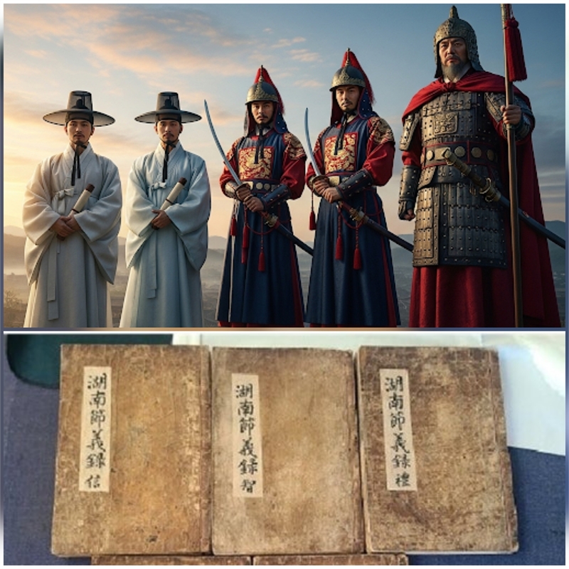 나주 수성최씨 5형제 모습을 AI로 표현하고, 5형제의 활약상이 수록된 호남절의록 표지(사진제공 네이버 검색, 유튜브 동영상 캡쳐, AI프로그램 이용)