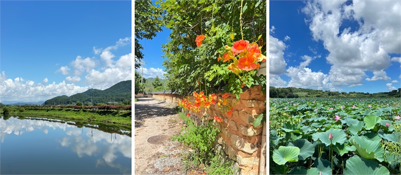 물무산 가는길에 만난 풍경(강변의 배롱나무 꽃, 돌담에 흐드러진 능소화, 들녁에 피어난 연꽃과 파란하늘)