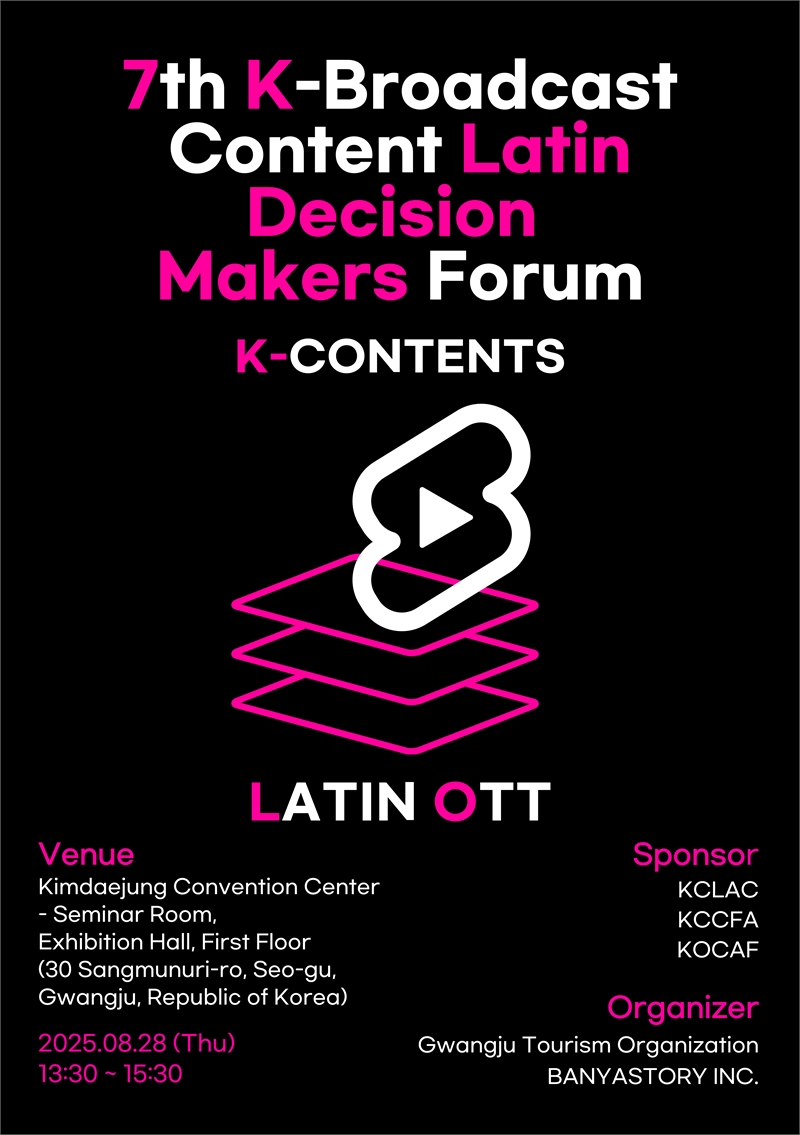 대한민국 K-콘텐츠의 글로벌 확산과 라틴 아메리카 시장과의 교류 확대를 논의하는 「제7회 라틴 K-콘텐츠 디시전 메이커스 포럼」이 내일(8월 28일) 오후 1시 30분부터 3시 30분까지 광주 김대중컨벤션센터에서 개최된다. 이번 포럼은 광주광역시 관광공사와 바냐스토리㈜가 공동 주관하며, 한·중남미협회, 한·쿠바문화친선협회, K콘텐츠아카데미포럼이 후원한다.