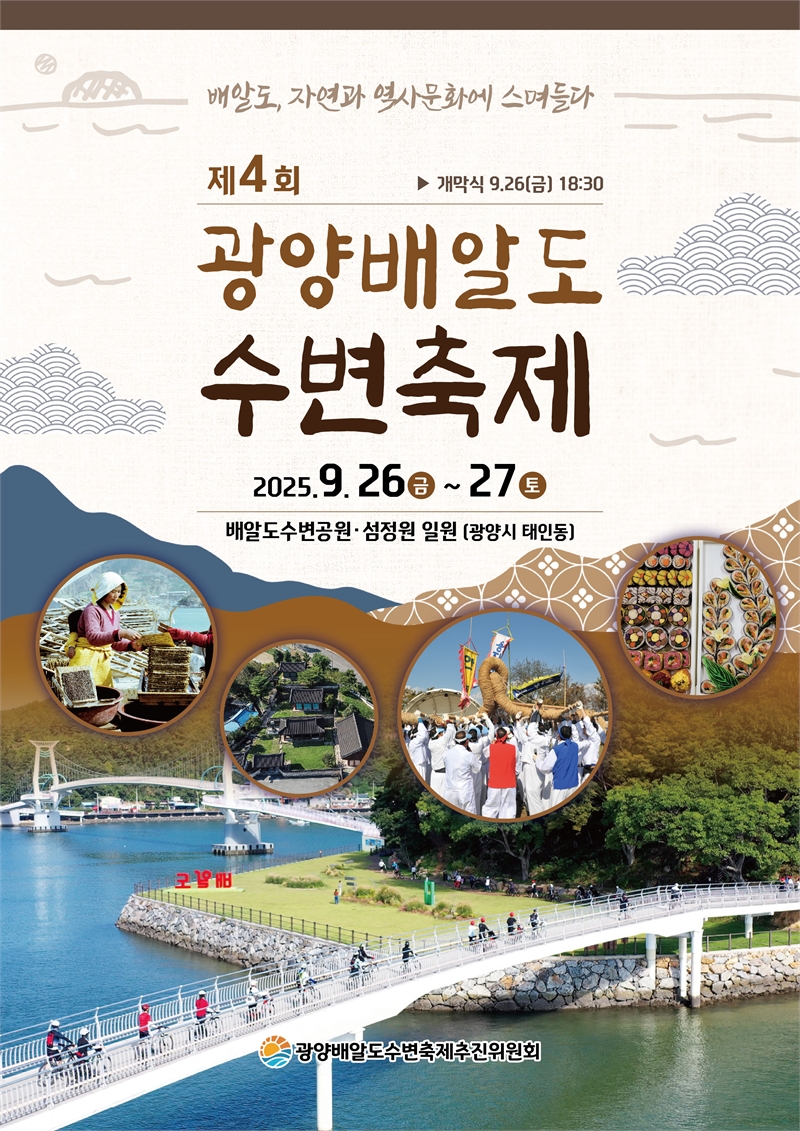 제4회 광양배알도수변축제가 오는 9월 26일과 27일 이틀간 광양시 태인동 배알도 수변공원·섬정원 일원에서 개최된다.