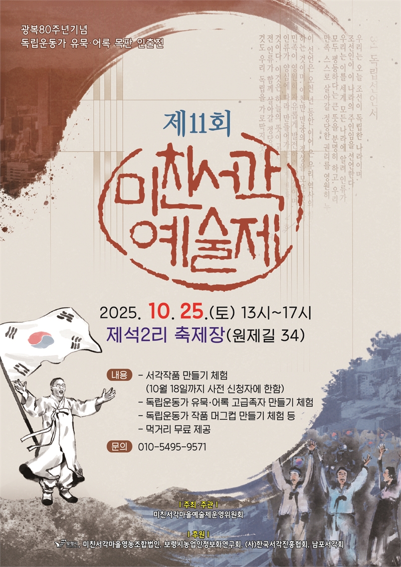 올해로 11회째를 맞는 이번 축제는 광복 80주년을 기념하여 독립운동가 유묵·어록 목판 인출전과 함께, 고급족자·머그컵 만들기 체험, 서각 예술 전시 및 주민 공연 등 시민이 함께 즐길 수 있는 프로그램으로 채워진다.