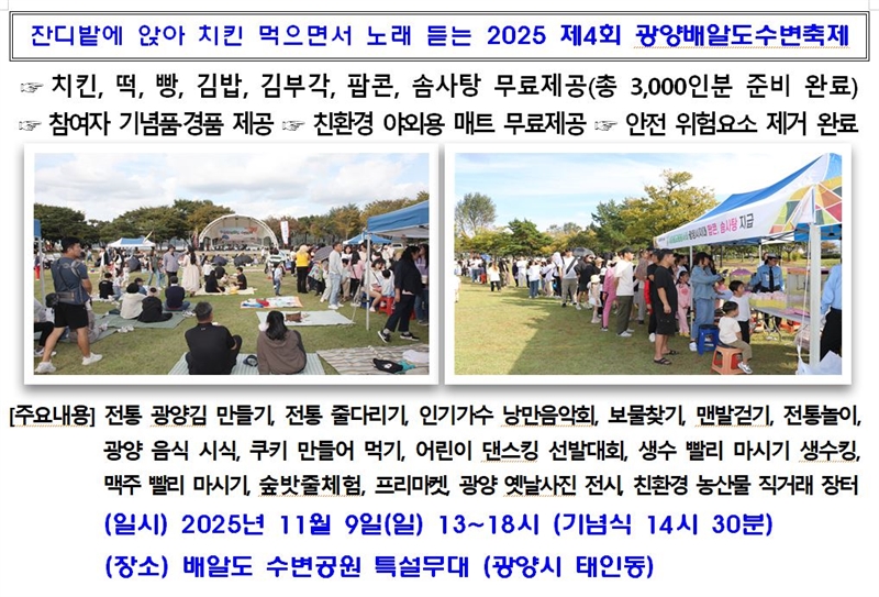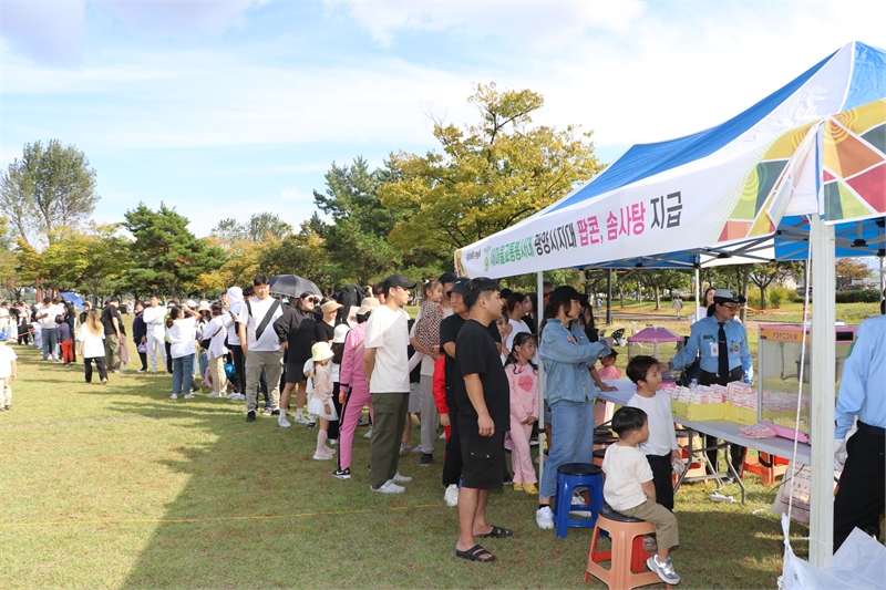 축제 현장에서는 치킨, 김밥, 김부각, 팝콘, 솜사탕, 빵, 떡 등 먹거리가 무료로 제공되고, 가족 단위 방문객을 위해 친환경 야외용 매트가 무료 제공되며, 행사 전 안전 점검을 통해 위험 요소 제거를 완료하여 참여자들이 안전하게 수변축제를 즐길 수 있도록 했다.