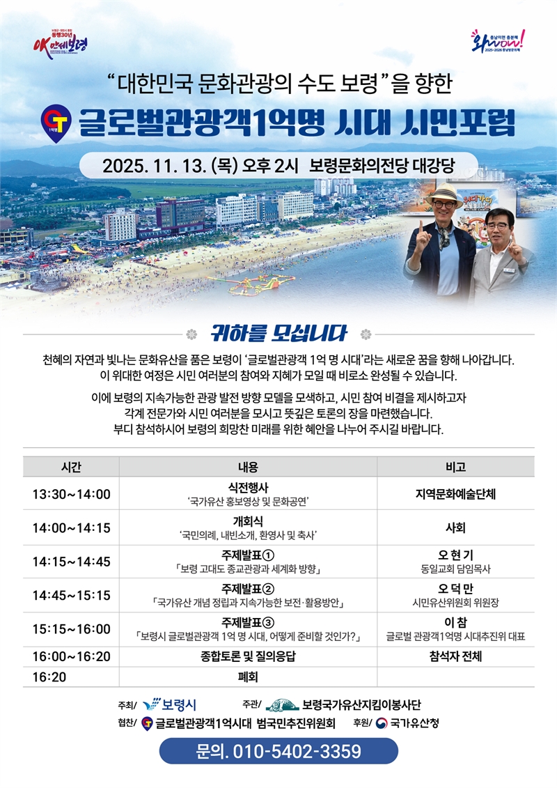 보령시는 오는 11월 13일(목) 오후 2시, 보령문화의전당 대강당에서 「대한민국 문화관광 수도 보령을 향한 글로벌관광객 1억명시대 시민포럼」을 개최한다고 밝혔다.