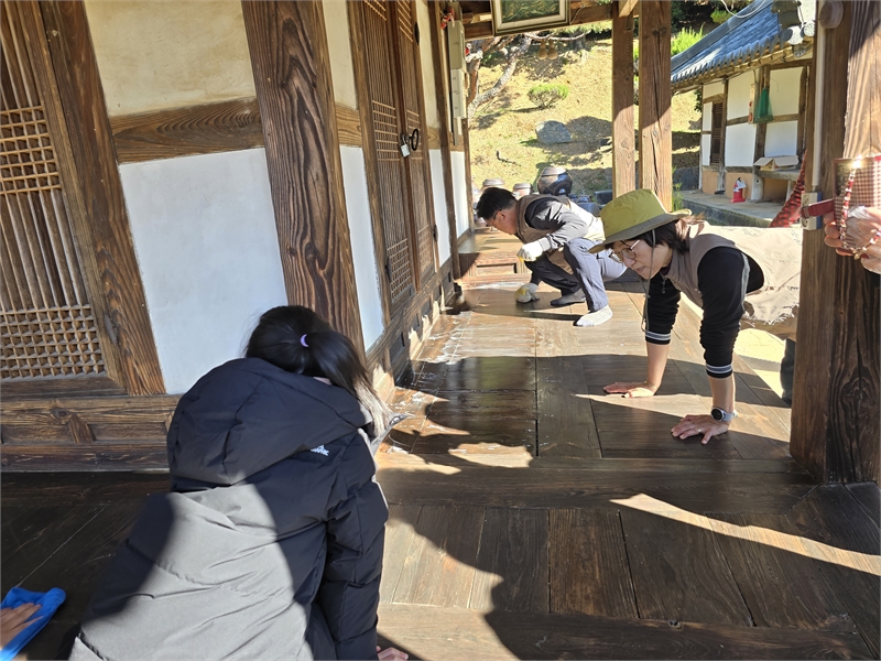 ◆무진주 지킴이 회원과 자원봉사자들은 짚솔 청소, 콩댐 작업 등 전통 방식의 보존 활동을 펼쳤다. 작은 붓솔로 문살의 먼지를 털어내고 짚솔로 마루 먼지를 닦고, 전통적인 마루 콩댐작업을 통해 가옥 보존에 힘을 보탰다.