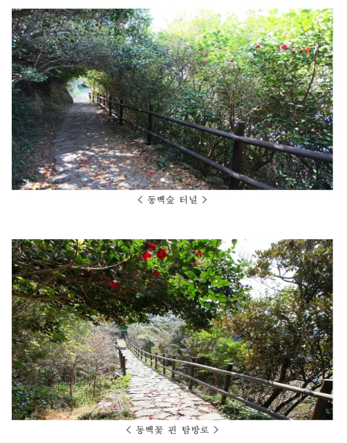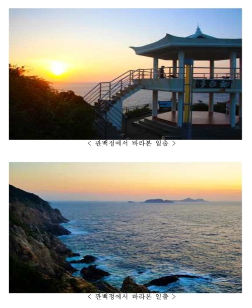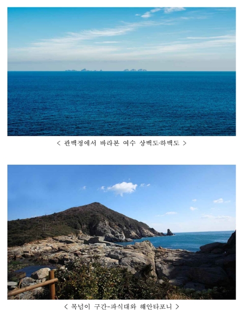 「여수 거문도 수월산 일원」은 목넘이를 지나 거문도 등대로 이어지는 탐방로에 동백나무숲이 울창하여 개화시기에 아름다운 경관을 연출하며, 숲 사이로는 기암괴석이 어우러진 해안 풍광과 낙조 장면을 조망할 수 있다. 특히 탐방로 끝 절벽에 자리한 거문도등대와 백도를 바라본다는 이름의 관백정(觀白亭)에서는 명승으로 지정된 여수 상·하백도와 일출도 감상할 수 있어, 대표적 경승지로 손꼽힌다.