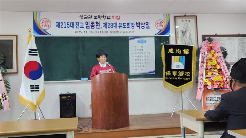 재단법인 충청남도 향교재단 보령향교(保寧鄕校)는 26일 보령향교 대성전에서 고유례를 봉행하고, 이어 유림회관에서 제215대 전교 및 제28대 유도회장 이·취임식을 성대히 개최했다.
